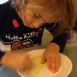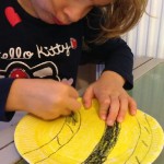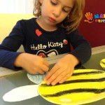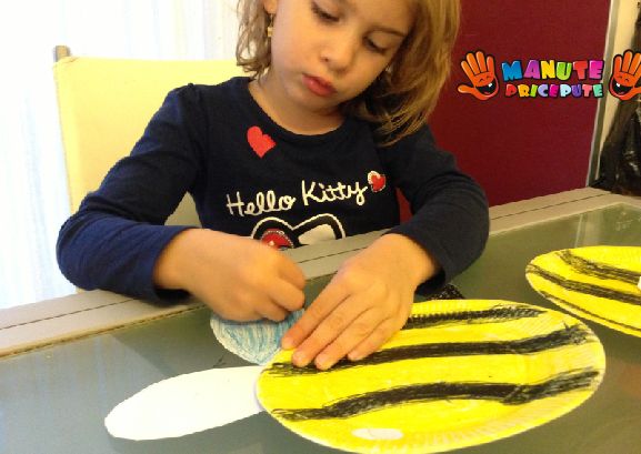 - Coloram farfuria de hartie cu ajutorul creioanelor cerate in galben, apoi trasam dungile albinutei si rugam copilul sa deseneze liniile.